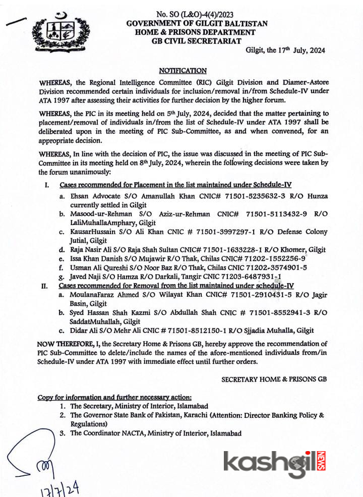 عوامی ایکشن کمیٹی گلگت بلتستان کے چیئرمین احسان علی ایڈوکیٹ، سمیت اعلیٰ قیادت کا نام شیڈول فور میں شامل کیا گیا۔